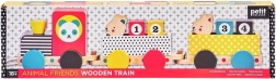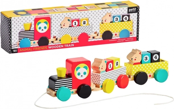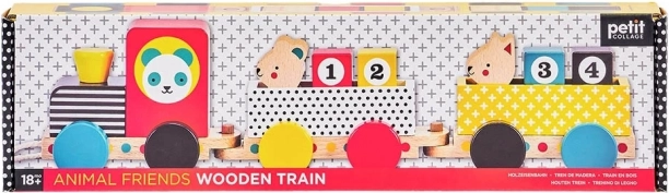 Ez a modern fa kisvonat egy mozdonyból és két vagonból áll, négy számos kockával és két aranyos állatfigurával. A gyerekek zsinóron húzhatják, építhetik és átrendezhetik a kockákat és figurákat, miközben fejlődik a képzeletük, a logikájuk, valamint a finom- és nagymozgásuk.