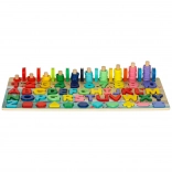 A feltűnő színek és a gondos kivitelezés támogatják a kreativitást és a logikus gondolkodást. Minden elem simára csiszolt a biztonságos játék érdekében. A készlet ideális első ismerkedéshez a színekkel, a geometriai formákkal, a számokkal és az alapvető műveletekkel.