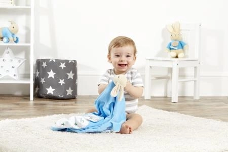 A külső oldal finom kék színű, a belsőt a Beatrix Potter történetei által ihletett bájos illusztrációk díszítik. Kompakt, 37,5 × 37,5 cm-es méretének köszönhetően tökéletes a babakocsiba, autósülésbe és kiságyba.