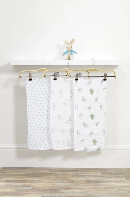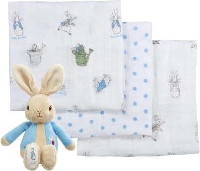 Ez a gyönyörű ajándékcsomag 3 muszlin pelenkát és egy Péter plüss nyuszit tartalmaz. A pelenkák 100% pamutból készülnek, moshatók és mindegyik különböző mintázatú.