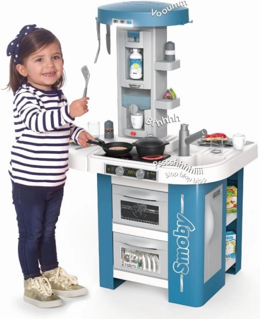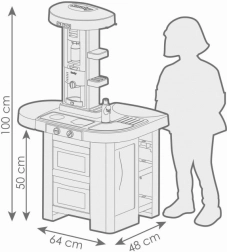 A konyhai lap modern elektronikus főzőlappal van felszerelve, amely két főzési hanggal és piros fénnyel szimulálja a valódi főzést. Az interaktív kávéfőző újratölthető tartállyal utánozza a kávékészítés folyamatát, míg a szagelszívó három zajszintet és világítást nyújt.
