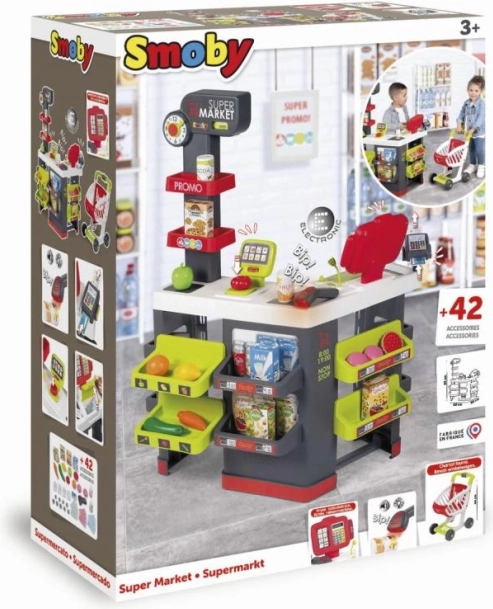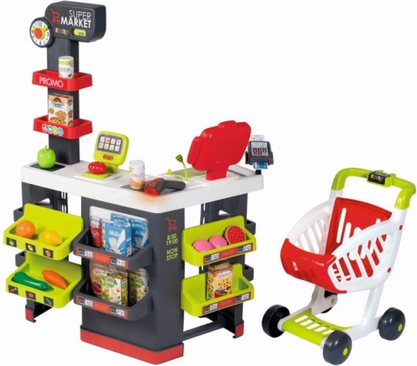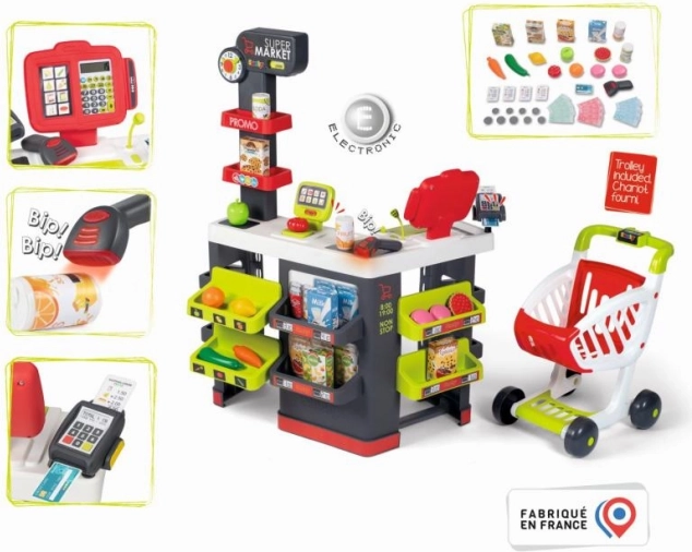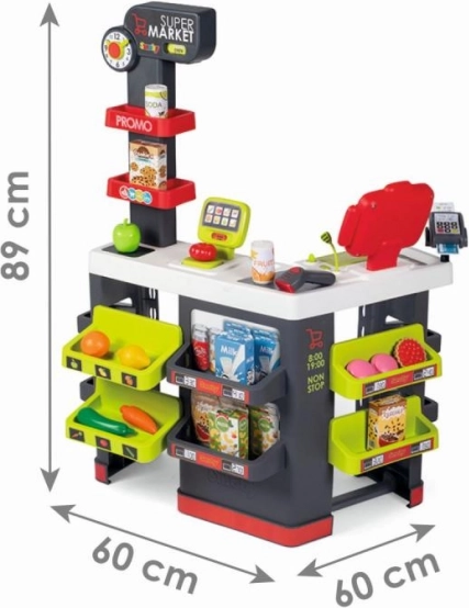 Gyerekjáték Szupermarket Smoby lehetőséget nyújt a gyerekeknek, hogy saját boltjuk vezetőivé váljanak. Különféle játéktérzónákkal és funkciókkal, mint a mérleg és az effektes elektronikus szkenner, a gyerekek mérhetnek gyümölcsöt és zöldséget, szkennelhetik az árukat és számolhatják az árat LCD kijelzős számológéppel. Minden a kreativitást ösztönzése és a szociális képességek fejlesztése érdekében lett tervezve.