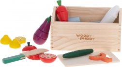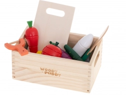 - répa, petrezselyem (retek), uborka, paradicsom (szeletekkel együtt), citrom, padlizsán, vágódeszka, biztonságos kés, biztonságos hámozó, fa ládika