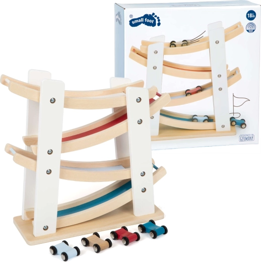 Fedezze fel a legkisebbeknek szánt szórakozást a Small Foot fa versenypályájával és kisautóival! A természetes fából készült masszív kivitel, a négy színes kisautó és a sima, kaszkádos rámpákon való suhanás fejleszti a finommotorikát, a szem–kéz koordinációt és az ok–okozati összefüggések megértését. Ideális játék 18 hónapos kortól a mindennapi kreatív játékhoz.