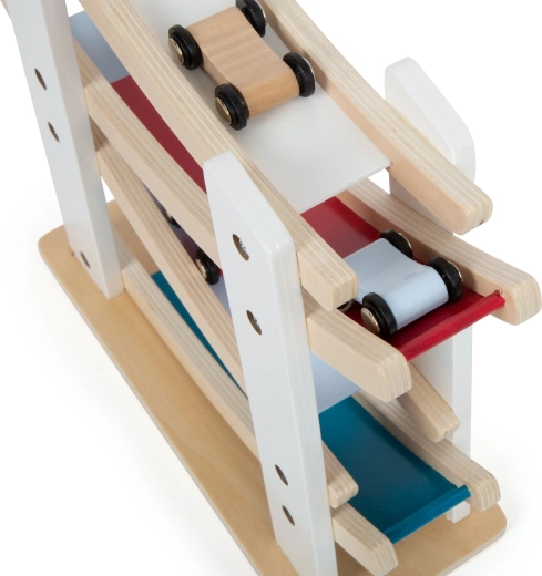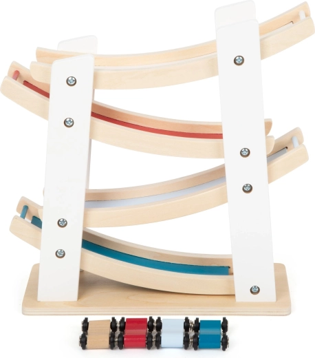 Ez a minőségi fa pálya egyszerű elven működik, amit a gyerekek imádnak: helyezze a kisautót a legfelső szintre, és figyelje, ahogy fürgén lesiklik a kanyarokon egészen az aljáig. A stabil alap és a sima felületek biztonságos és tartós használatot garantálnak.