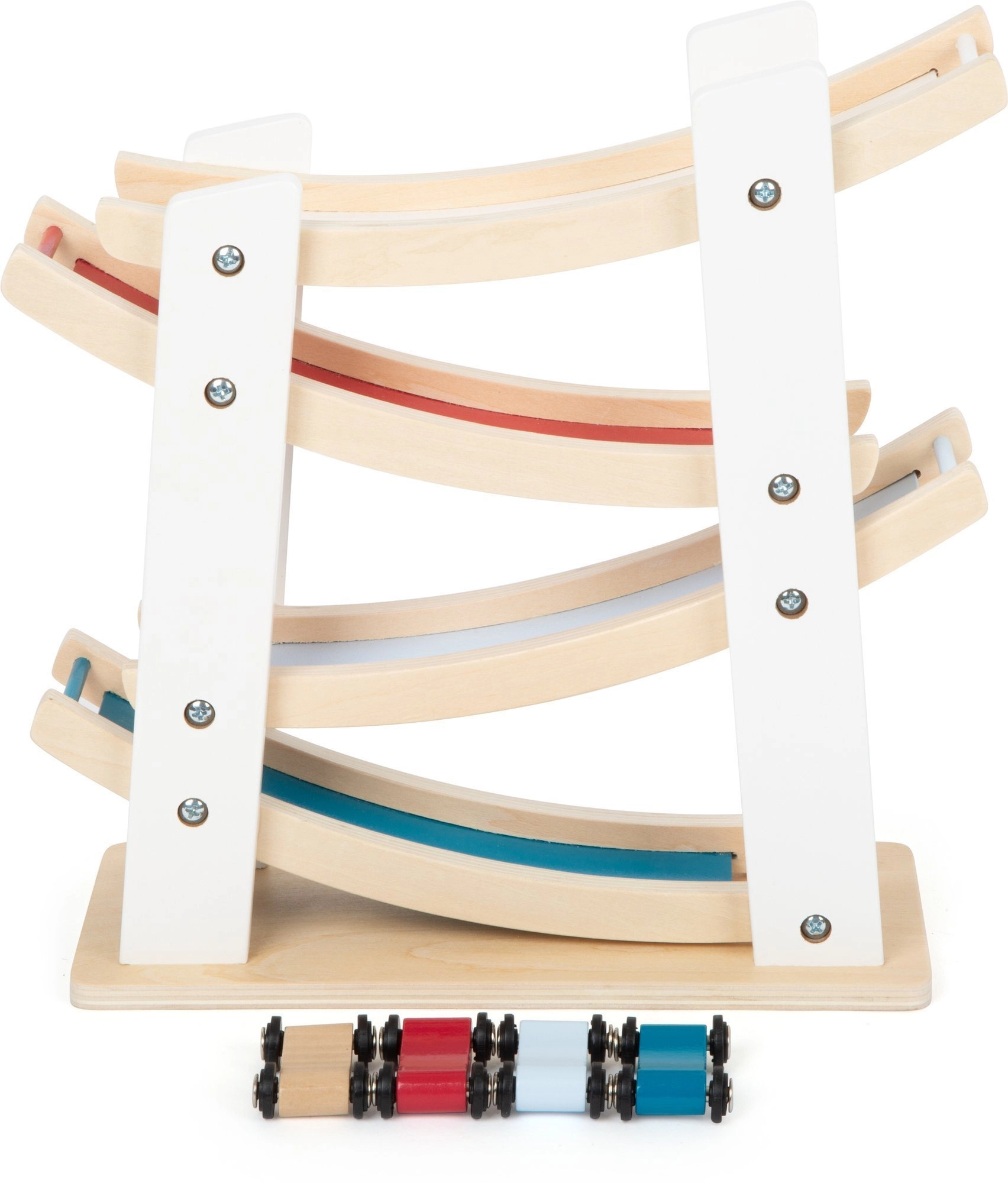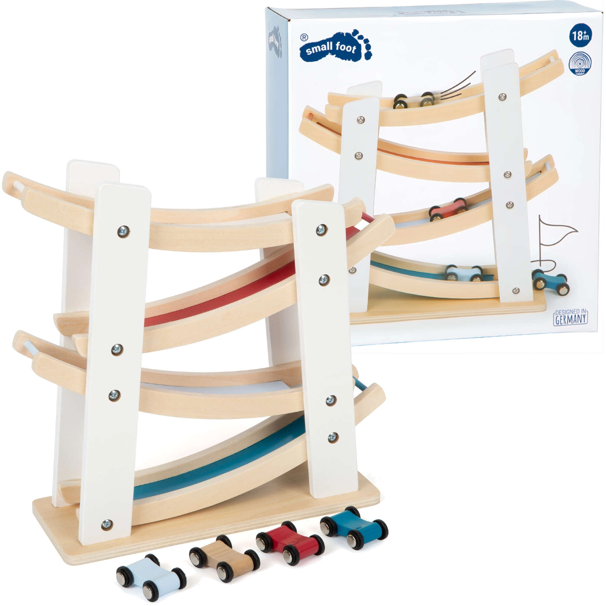 A csomag tartalmaz egy komplett pályát és 4 kisautót különböző színekben. Az időtálló, természetes megjelenés színes csíkokkal könnyedén illeszkedik a gyerekszobába, és támogatja a koncentrációt valamint a felfedezés örömét.