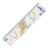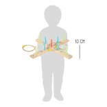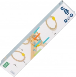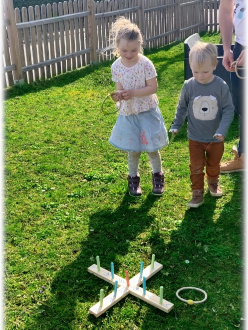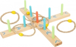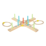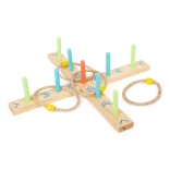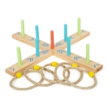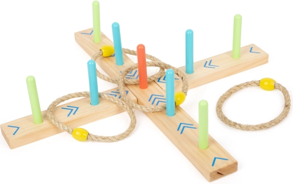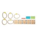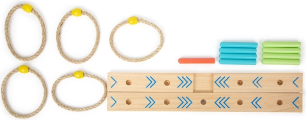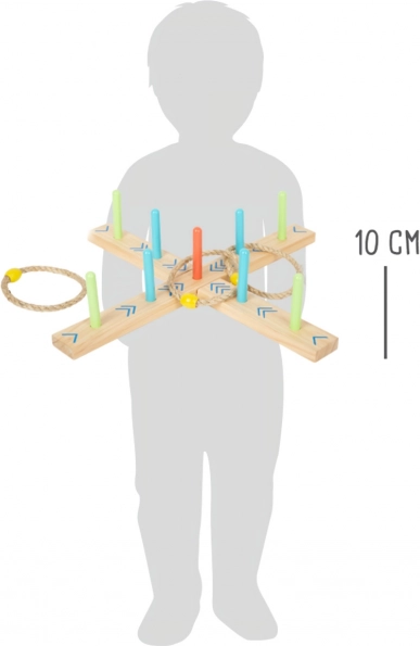 A karikadobás szórakoztató családi játék, ami javítja a készségeket és a koordinációt. A talapzat 100% FSC4 tanúsítvánnyal rendelkező fából készült, amely biztosítja a fenntartható és környezetbarát alapanyagokat. A színes nyilaknak köszönhetően a gyermekek könnyen számolhatják a pontokat, anélkül hogy ismernék a számokat. A csomagolás tartalmaz egy hordozható pamut zsákot az egyszerű tárolás érdekében.