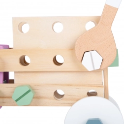 Ez a minőségi, skandináv stílusú fa építőkészlet igazi mérnökökké varázsolja a kis építőket. A gyerekek a villáskulcs és a csavarhúzó segítségével maguk állítanak össze különféle modelleket – járművektől az egyszerű szerkezetekig –, és ugyanolyan könnyen ismét szétszerelik őket. A látható faerezet és a pasztellszínek együttese stimulálja az érzékeket, és a játékot kellemesebbé, biztonságosabbá teszi.