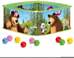 Játszómedence a „Masha és a medve” sorozat motívumaival, sok színes labdával, amely bármely gyerekszobába illik. A gyerekeknek remek szórakozás akár több órán át, támogatja a szenzomotoros fejlődést. A színes gyerek labdák puhák, mégis tartósak, és összenyomás után visszanyerik eredeti alakjukat. Beltéri és kültéri használatra is alkalmas (száraz időben). A medence könnyen fel- és szétszerelhető a helytakarékosság érdekében. Praktikus, fogantyúval ellátott kartondobozban csomagolva. Fő jellemzők: medence és 50 színes labda, az összeállított medence mérete 75×75×30 cm, beltéri és kültéri használat, egyszerű összeszerelés, praktikus csomagolás