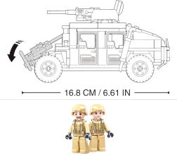 Építsd meg saját katonai Hummer járművedet két mini figurával és működő fegyverzettel. A masszív építőkockákból álló készlet fejleszti a logikus gondolkodást, a finommotorikát, és közepes nehézségű építési élményt kínál. Teljes mértékben kompatibilis a LEGO, COBI és MEGA BLOKS készletekkel.