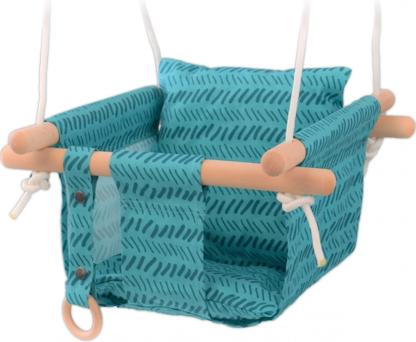 A szerelés gyors és praktikus: a csomagban 2 karabinert és magasságban állítható köteleket (legfeljebb 180 cm) talál, így a hintát könnyen a térhez és a felfüggesztés magasságához igazíthatja. A türkiz dizájn játékos akcentust ad bármely gyereksaroknak, játszótérnek vagy kertnek.