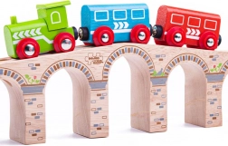 A BIGJIGS RAIL híd lenyűgöző magasságot és hosszúságot ad a vonatpályádnak. A masszív fa kialakításnak és a sima csatlakozásoknak köszönhetően a vonatok egyenletesen haladnak, miközben az ívek alatt bőséges hely jut még a magas rakományoknak is. A kőfalat idéző, elegáns díszítés valósághű megjelenést kölcsönöz a készletnek.