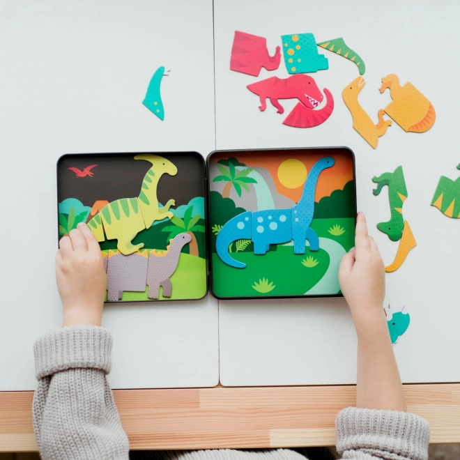 A Petit Collage dinoszauruszos mágneses játékszett végtelen kreativitást és szórakozást nyújt a gyerekeknek. A masszív mágneses elemekkel könnyedén megalkothatják saját dinoszauruszaikat és jeleneteiket, amelyek két tematikus háttéren kelnek életre. A praktikus fém doboz mindent egyben tart, és remek választás utazáshoz.