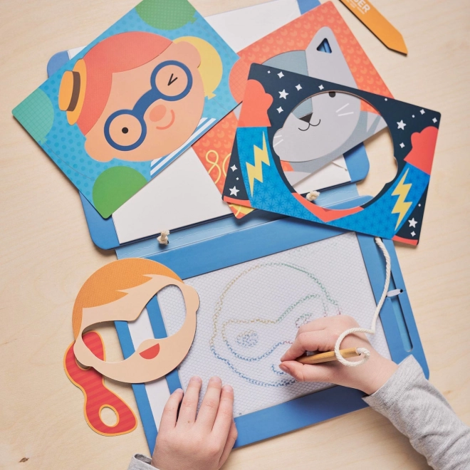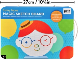 Ez a rajztábla kompakt mérete 27x19x1 cm, és tartalmaz egy könnyen használható ceruzát, amely madzaggal a táblához van rögzítve. A törlőrendszer és a sablonok segítségével a gyerekek könnyen új alkotásokat varázsolhatnak az ötleteikből!