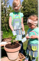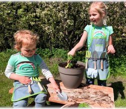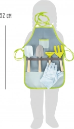 A készlet része a kesztyű, amely védi a gyerekek kezeit, valamint a kötény, amely megóvja a ruhát a kertészkedés és az alkotás közben.