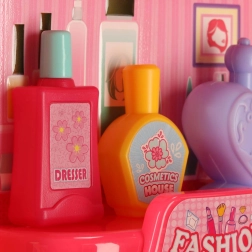 • Gazdag kiegészítő-készlet: tükör, fésű, gyerek „hajszárító”, csatok, gyűrűk, karkötők, matricák és üvegcsék, amelyek körömlakkot és parfümöt imitálnak.