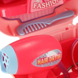 A készletben fésűk, tükör, üvegcsék, hajbavalók és további kellékek találhatók a valósághű fodrász- és kozmetikai szerepjátékhoz.