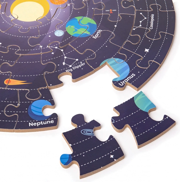 Ez a termék ötvözi a játékot és a tanulást, mivel minden darab összerakása fejleszti a kognitív képességeket és a naprendszer ismereteit. A kirakó kiváló minőségű és felelősen származó anyagokból készült, amelyek megfelelnek a szigorú európai biztonsági szabványoknak.