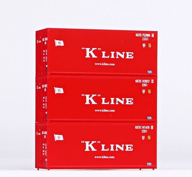 Ez a készlet három részletesen kidolgozott húszlábú konténert tartalmaz K-Line, amely ideális cserére vagy pótlásra platós és zsebes kocsikon, köszönhetően a alacsonyan fekvő súlypontnak az optimális menetjellemzők érdekében.
