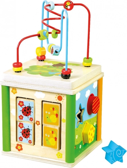 A különböző tevékenységek révén a gyerekek játékos módon fejlesztik a logikus gondolkodást, a koncentrációt és a kreativitást. A kocka tartós fából készült, fém elemekkel kiegészítve, így a mindennapos felfedezést is jól bírja.