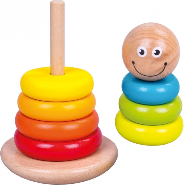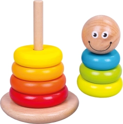 A színes gyűrűkkel ellátott fa rakosgató ösztönzi a természetes, játékos tanulást. A gyerekek gyakorolják a méret szerinti válogatást, a színek megkülönböztetését és a kézügyességet a gyűrűk rúdra fűzése közben. A játék kellemesen sima felületű és stabil talppal rendelkezik a biztonságos használatért.