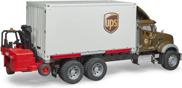 Bruder teherautó Mack UPS sok funkcióval rendelkezik, amelyek szimulálják a valódi teherautót. Az nyitható vezetőfülke és a rakodótér ajtóinak köszönhetően könnyen kezelhető modellel belül. Beleértve az integrált magasemelésű targoncát, amelynek változó villái különböző típusú rakományokhoz használhatóak.