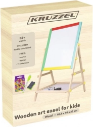 Ez a KRUZZEL kétoldalas tábla két felületet kínál rajzoláshoz és íráshoz: krétás és szárazon törölhető. Az egyszerű forgatás és a pillangócsavarok gyors oldalcserét tesznek lehetővé. A fa keret színes elemekkel masszív, sima és biztonságos a gyerekek számára.