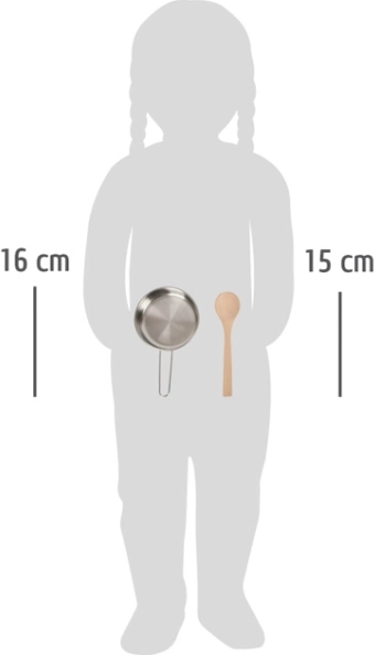 A levehető fedelű lábas hozzásegít a valósághű játékszituációkhoz és fejleszti a gyermek képzelőerejét. A fakanál együtt a fém eszközökkel, mint a lapát és habverő, széles játék lehetőségeket kínál. A textilkesztyű és a fazékalátét autentikus hangulatot kölcsönöznek és hozzájárulnak a játék biztonságához.