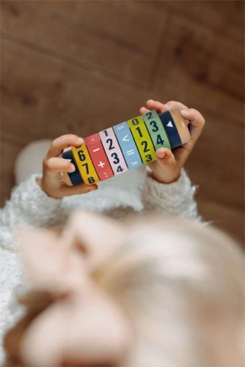 Minőségi faanyag, feltűnő színek és jól olvasható számjegyek segítik a koncentrációt, a tartósságot és a kényelmes fogást a gyerekek kezében.