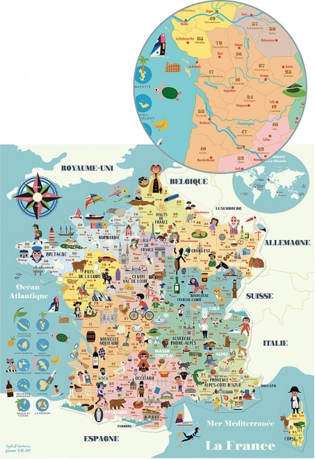 Ez a stílusos mágneses Franciaország-térkép ideális gyerekszobába és játszószobába. A masszív fa elemeknek és az áttekinthető kivitelezésnek köszönhetően a gyerekek elsajátítják az ismereteket a francia régiókról, városokról, nevezetességekről, hegyekről, folyókról és a tengerpartról. Nem hiányoznak a hivatkozások a gasztronómiára, a borvidékekre és a pezsgőre sem, ami hitelessé teszi a térképet.