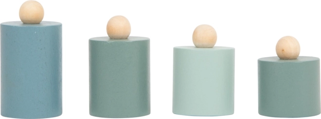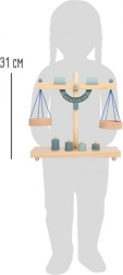A gyerekek könnyen megértik a kiegyensúlyozás elvét a két serpenyőnek és a különböző tömegű, fa súlyoknak köszönhetően.