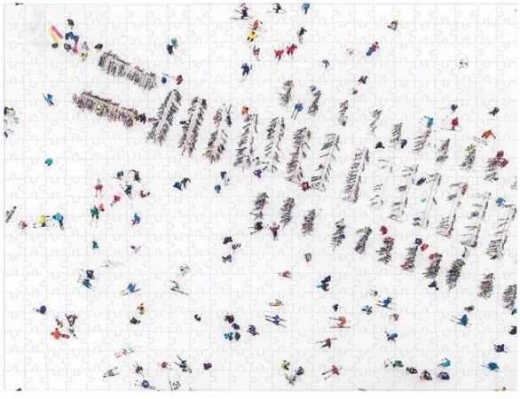 Fedezze fel a GRAY MALIN időtlen légifelvételeit egy prémium, kétoldalas puzzle formájában. Az egyik oldal nyugodt téli tájba vezet havas fákkal, a másik a rikító színekkel tündöklő síelők dinamikájával kel életre a vakító fehér havon. Minden darab pontosan illeszkedik, a kirakás így folyamatos és kielégítő.