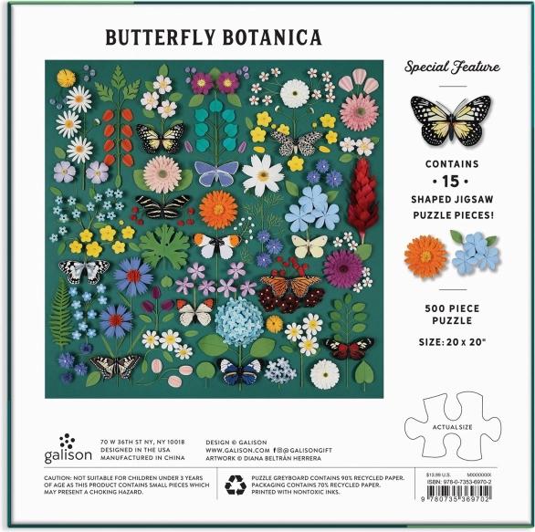 A Butterfly Botanica puzzle örömet szerez minden természetkedvelőnek és a nyugodt kikapcsolódás híveinek. A gazdag botanikai illusztráció ragyogó lepkékkel és virágokkal kirakva 50,8 × 50,8 cm-es méretben érvényesül. A 15 egyedi formájú elemnek köszönhetően a kirakás még szórakoztatóbb és látványosabb.