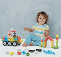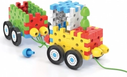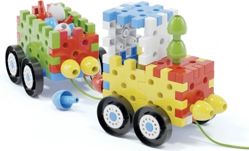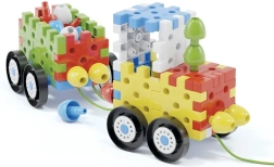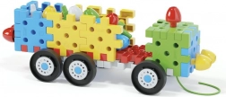 Építs az elemekből és csapokból autókat, házikókat és fákat! Ez az innovatív építőkészlet egymással összekapcsolható lapos 3D elemeket és különböző színű, nagy méretű csapokat tartalmaz, amelyeknek köszönhetően a legkisebbek is összeállíthatnak különféle autókat, házakat, tornyokat, fákat és még sok minden mást. A készlet összesen 62 eleme között 8 kerék található az autók alvázához, valamint 3 zsinór, amelyekkel az autókat húzni lehet. Az autók mellett a készlet különféle síkbeli és térbeli struktúrák létrehozását is lehetővé teszi, így a 2–6 éves gyerekeknél fejleszti és gyakoroltatja a finommotorikát, a szem–kéz koordinációt és a térbeli tájékozódást, miközben támogatja kognitív fejlődésüket. Csomag tartalma: 20 egymással összekapcsolható lapos 3D elem, 16 egymással összekapcsolható csap, 8 kerék, 3 zsinór az autók húzásához. Fő jellemzők: fejleszti a finommotorikát, a kreativitást, a fantáziát és a logikai-kombinatív gondolkodást; a csomag 52 elemet tartalmaz; 2 éves kortól ajánlott.