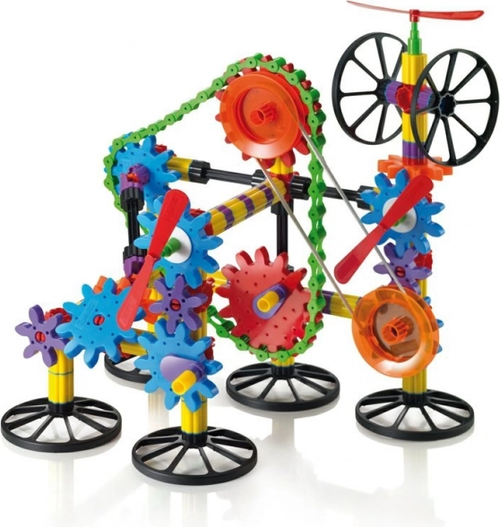 Kösse össze a fogaskerekeket, a láncot és a rugalmas szíjat, és figyelje, hogyan adódik át a forgó mozgás távolabbi pontokra is. Remek bevezetés a technika világába.