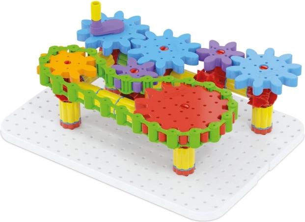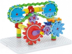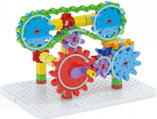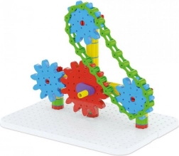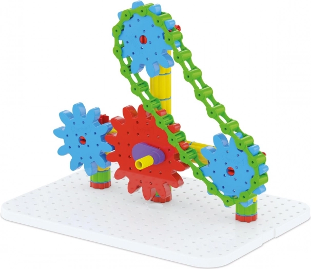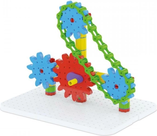Az építőkészlet tartós műanyagból készült, és 5 éves kortól ajánlott. Tartalmazza a fehér alaplemezt, különféle méretű fogaskerekeket, láncot és még sok mást, lehetővé téve a gyerekek számára, hogy felfedezzék a mechanikai mozgás új világát.