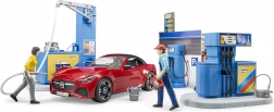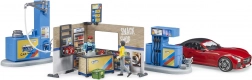 A csomag része egy variálható sportautó levehető kerekekkel és tetővel, amely teljes mértékben kompatibilis a BRUDER BWORLD figuráival és kiegészítőivel. A kétoldalas nyomtatott díszletek, a polcok kannákkal és az árlista támogatják a kreatív és tanulságos játékot.