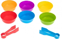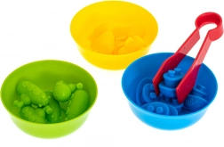 Hat, egymásnak megfelelő színű tálka és a mini járművek készlete motiválja a gyerekeket a válogatásra és az összeadásra játékos formában.