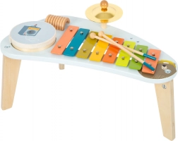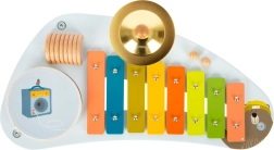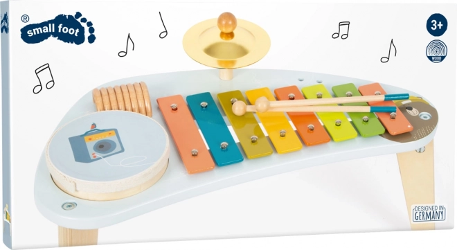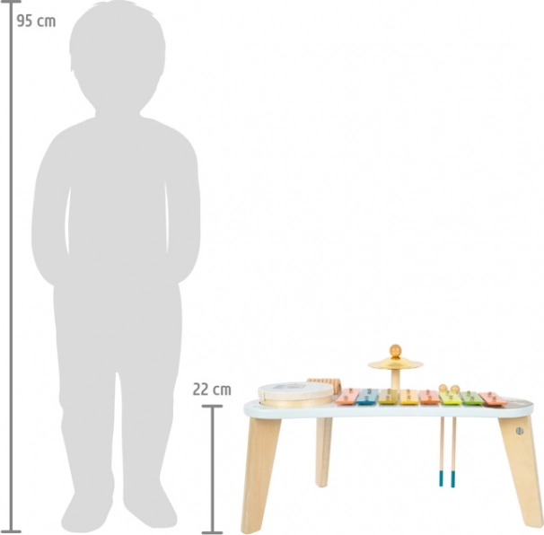 A Groovy Beats small foot zenélő asztalka átgondolt szett az első zenészlépésekhez. A masszív fa szerkezetnek és a három stabil lábnak köszönhetően a gyerekek biztonságosan fedezhetik fel a különféle hangokat – a xilofon dallamos tónusaitól a cintányér tiszta csengésén át egészen a levehető dob ütemeiig. A színkódolt billentyűk megkönnyítik a tanulást és gyors sikerélményt adnak.