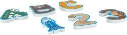 Színes betűk és számjegyek állatokkal, amelyek motiválják a gyerekeket az első szavak kirakására és a számolásra egyenesen a kádban.