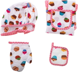 Ezzel az aranyos konyhai szettel a gyerekek felfedezhetik a főzés varázsát otthoni környezetben. Ideális a kézügyesség fejlesztésére és a szülő-gyermek együttműködés elősegítésére, nem okoz csalódást. Tartalmaz kötényt, kesztyűt, szakácssapkát és edényalátétet, amelyek mind cupcake motívumokkal díszítettek, feldobják a konyhai tevékenységeket.