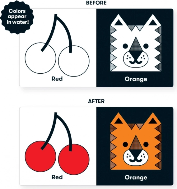 A Mudpuppy varázslatos fürdőolvasmánya minden fürdést örömteli felfedezéssé változtat. Elég a könyvet a vízbe meríteni, és a fekete-fehér illusztrációk ragyogó, színes képekké alakulnak. A gyerekek játékosan tanulják a színeket, észreveszik a víz által okozott változásokat.