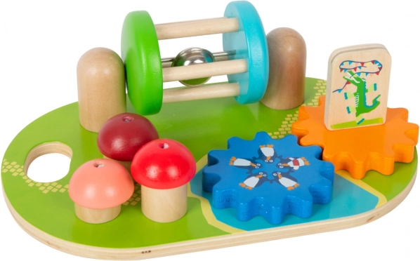 A fa tábla különféle mozgó elemeket, mint például fogaskerekeket és szivacsokat kínál a finommotorika fejlesztésére.