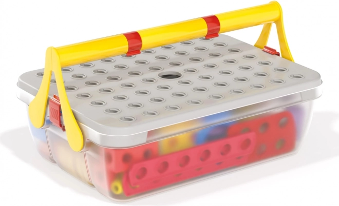 Minden elemet elhelyezhet a masszív, fogantyús dobozban. A perforált fedél építési felületként szolgál – ideális otthonra és utazáshoz is.