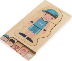 A készlet tartalmaz egy fa alapot és 28 egyedi elemet, amelyek a váztól egészen a figura ruházatáig épülnek fel. Egyszerű kialakításának és természetes anyagainak köszönhetően a puzzle követi a Montessori módszertan elveit, amely a gyermek átfogó nevelésére összpontosít.