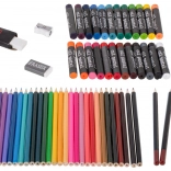 Színes ceruzák, olajpasztellek, grafitceruzák, radír és hegyező a precíz rajzhoz, árnyékoláshoz és élénk színfelületekhez.