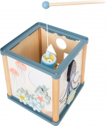 Ez a tengeri világ motívumú fa aktivitáskocka öt oldalnyi izgalmas tevékenységet és ráadásként mágneses horgászatot kínál – a berakó elemei mágneses horgászbottal közvetlenül a kocka belsejében foghatók ki. A színes tengeri illusztrációk fejlesztik a vizuális észlelést, a rugalmas polip pedig játékos elemmel motivál további felfedezésekre.