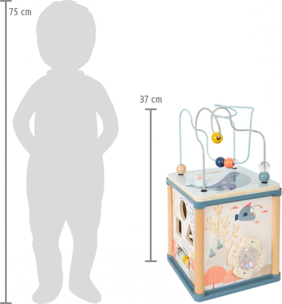 Az egyes oldalakon gyöngy- és csúszkás labirintus, számláló, forgó csörgő, tükrös fogaskerekek és formaberakó található. A játék fejleszti a kéz-szem koordinációt, a logikus gondolkodást és tréningezi a koncentrációt. A tető elforgatható, így minden elem és a labirintus belülre pakolható – a kocka nem foglal sok helyet, és a polcon is remekül mutat.