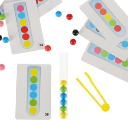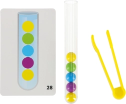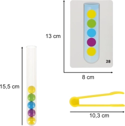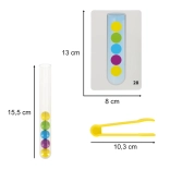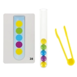 Fedezze fel a szórakoztató és interaktív módját, hogyan támogathatja gyermeke képességeit ezzel a nagy oktatási készlettel. A játék a golyók megfelelő kémcsövekbe rendezésére összpontosít kézzel vagy mellékelt csipesszel.