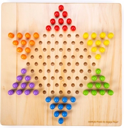 Klasszikus társasjáték az egész családnak, minőségi fa kivitelben. Fejleszti a logikát, a koncentrációt és a finommotorikát, lenyűgöz élénk színeivel és kellemes természetes anyagával. Tartalmaz játéktáblát és 60 bábut 2–6 játékos számára.